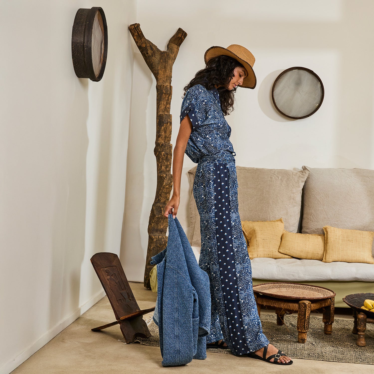 Une blouse ample, rentrée sur l’avant, crée une silhouette harmonieuse.