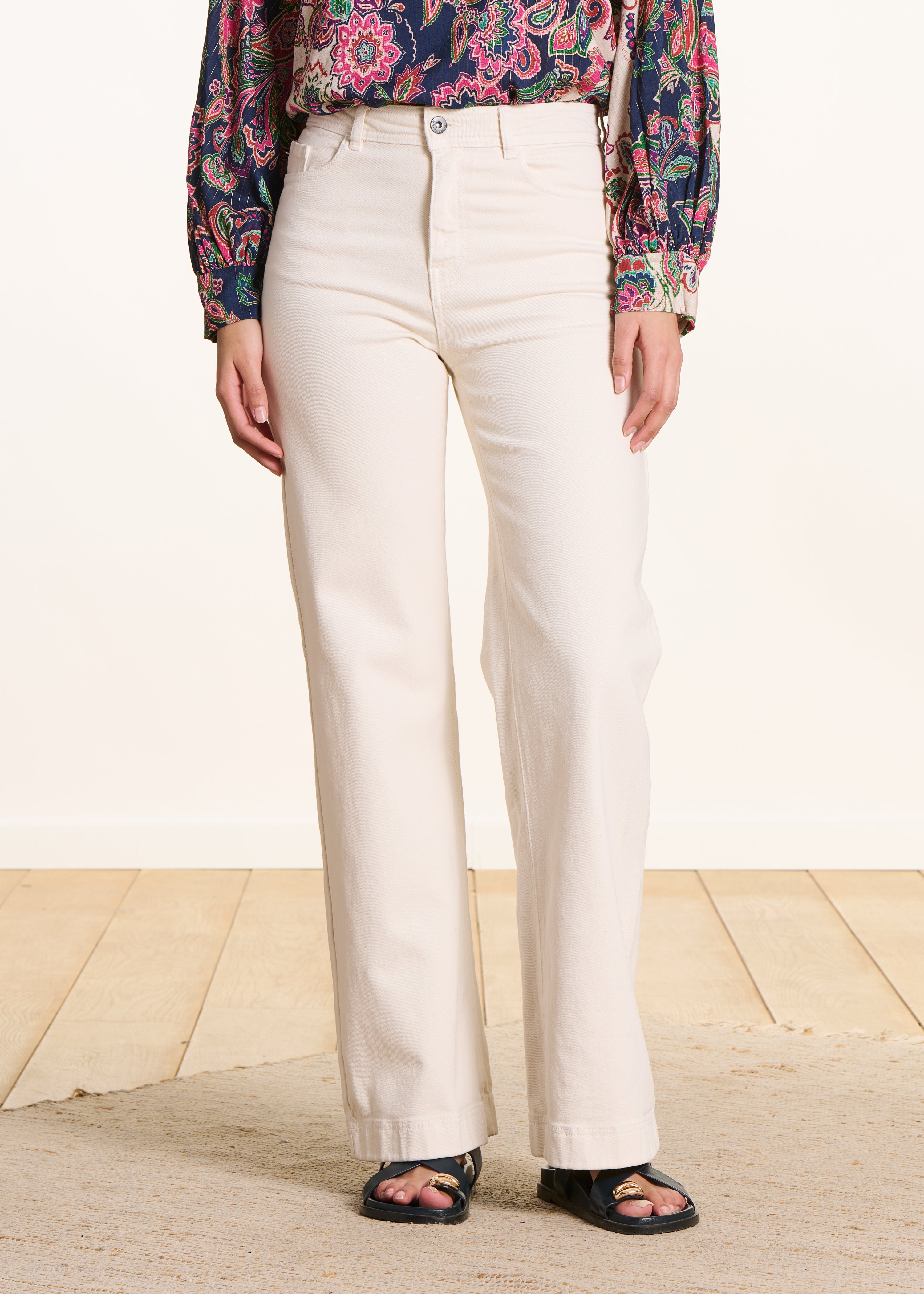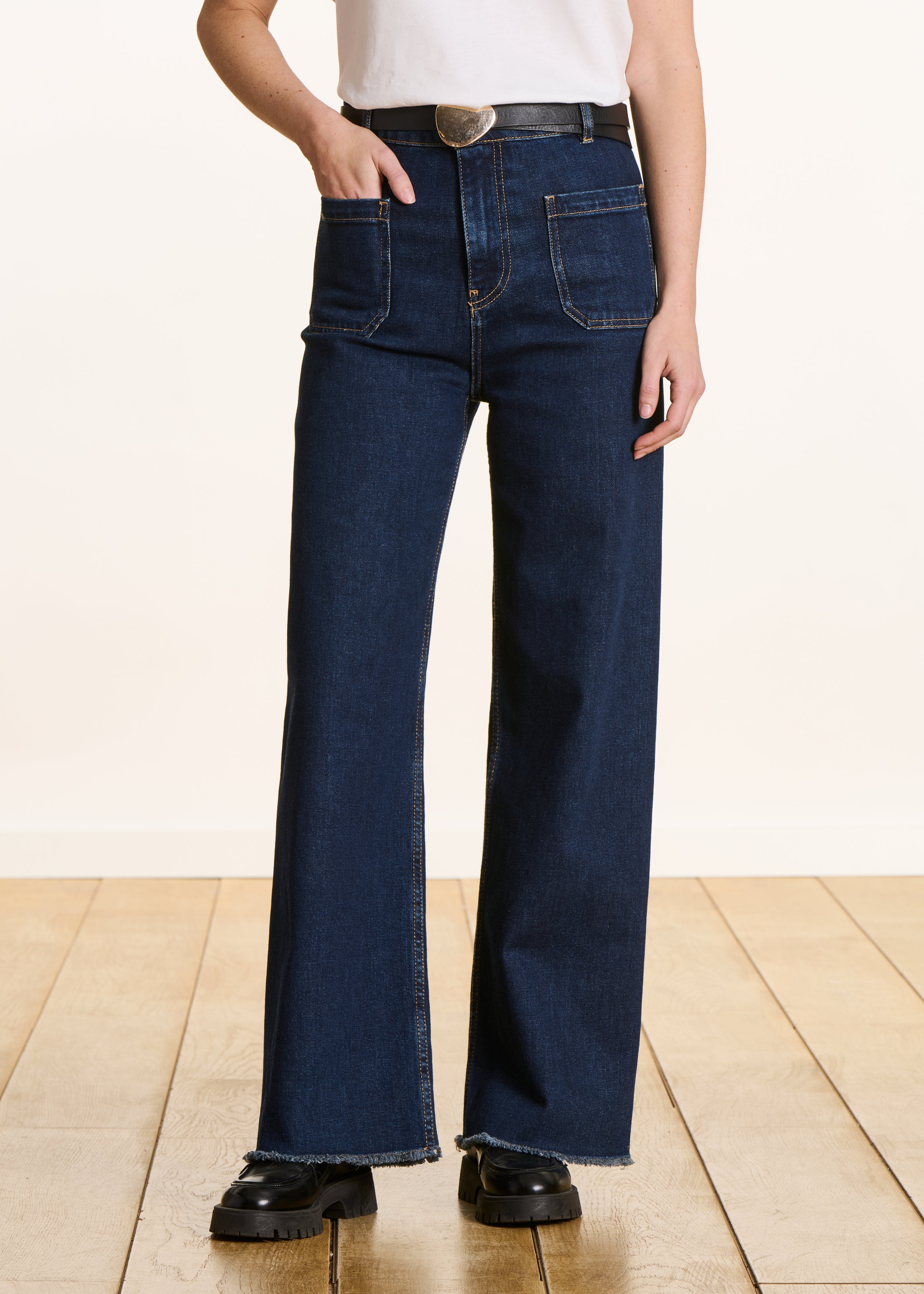 Con su cintura alta, su corte acampanado y su acabado de bordes limpios, los vaqueros Reno alargan la silueta con estilo. Morfología: V