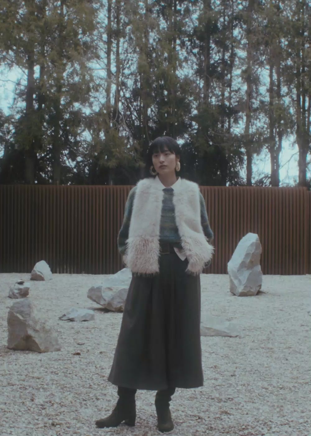 Veste écrue courte sans manches patchwork fausse fourrure
