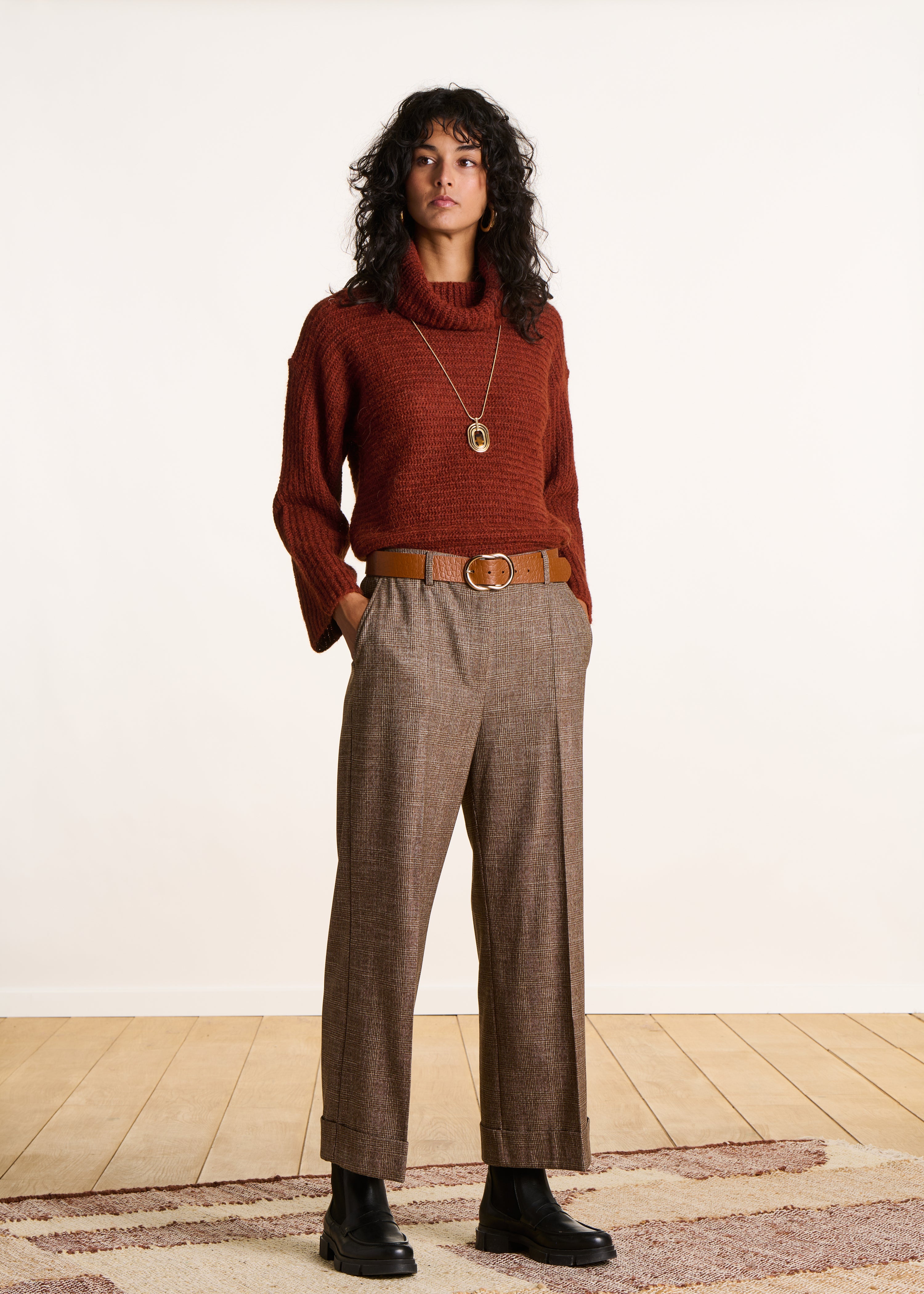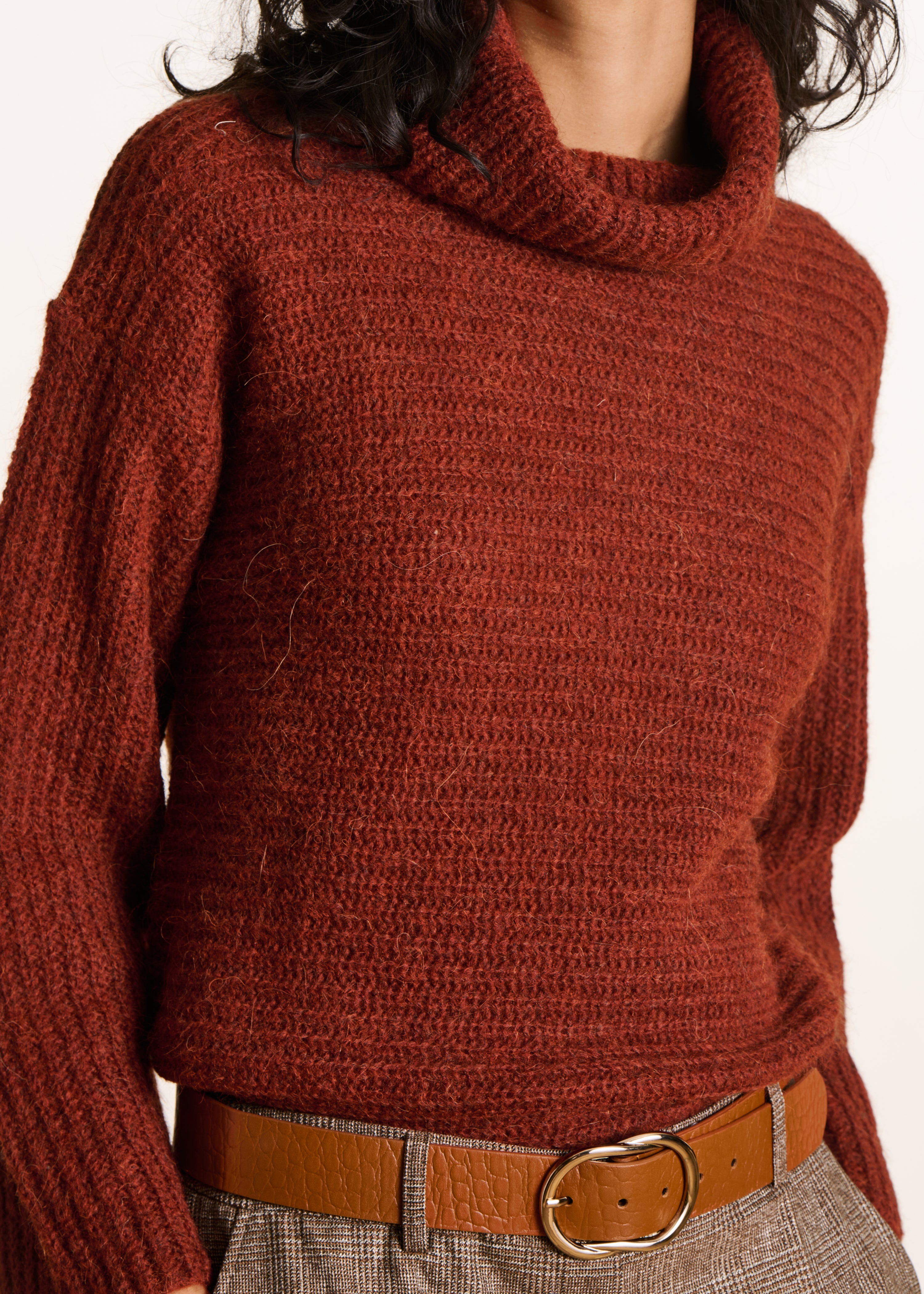 - Pull en maille côtes perlées horizontales - Col boule - Manches longues - Coupe ample - Contient de la laine et de l'alpaga