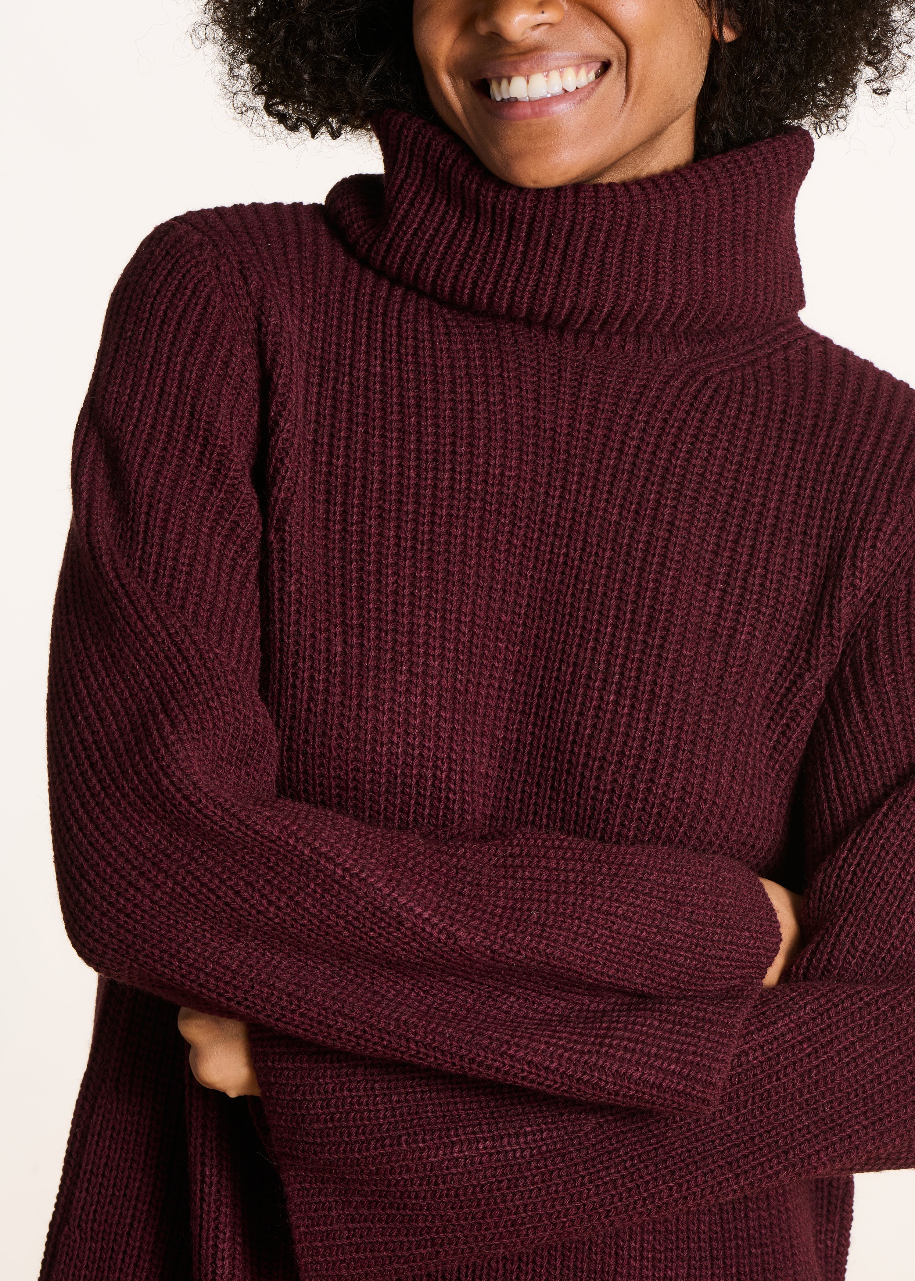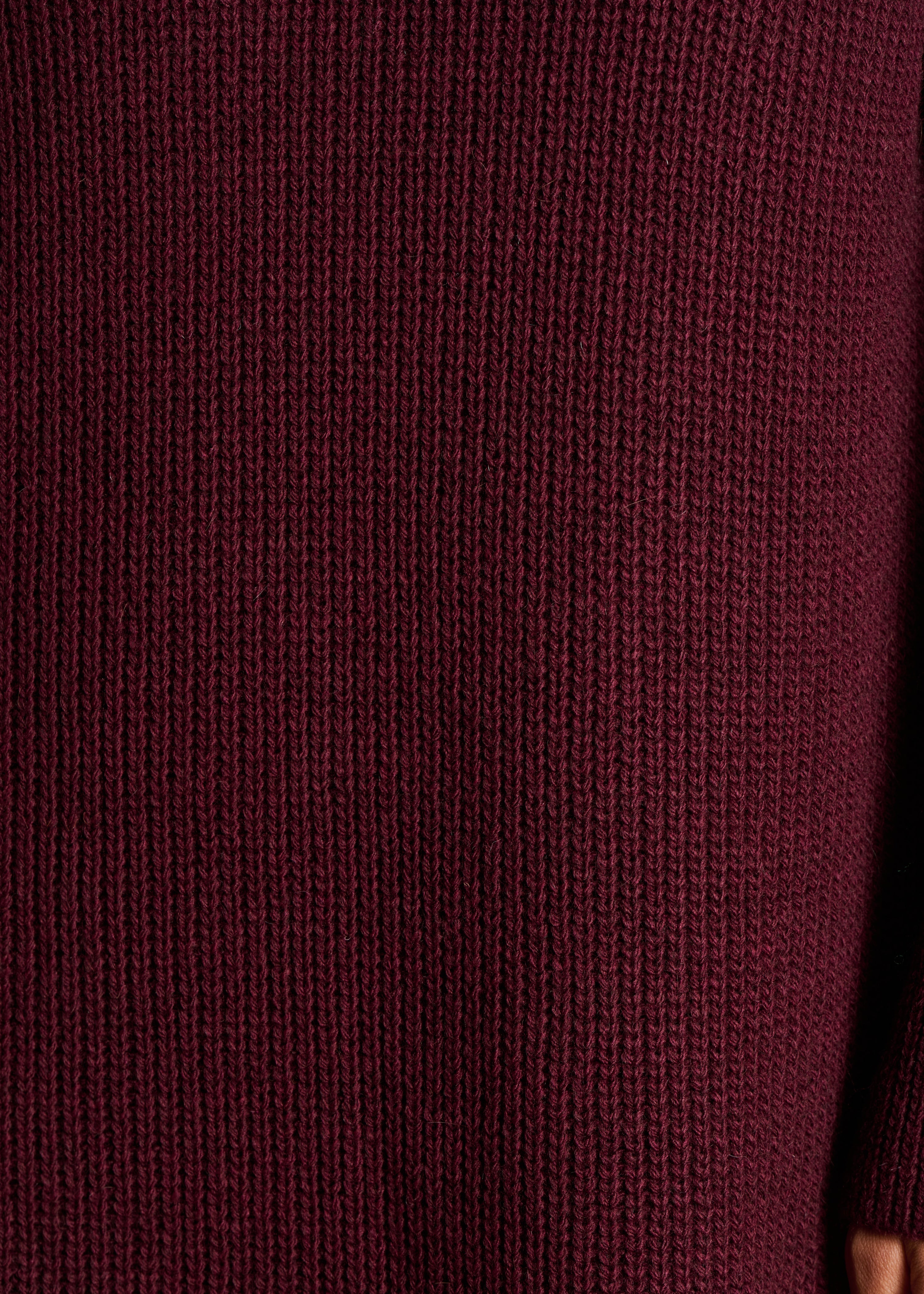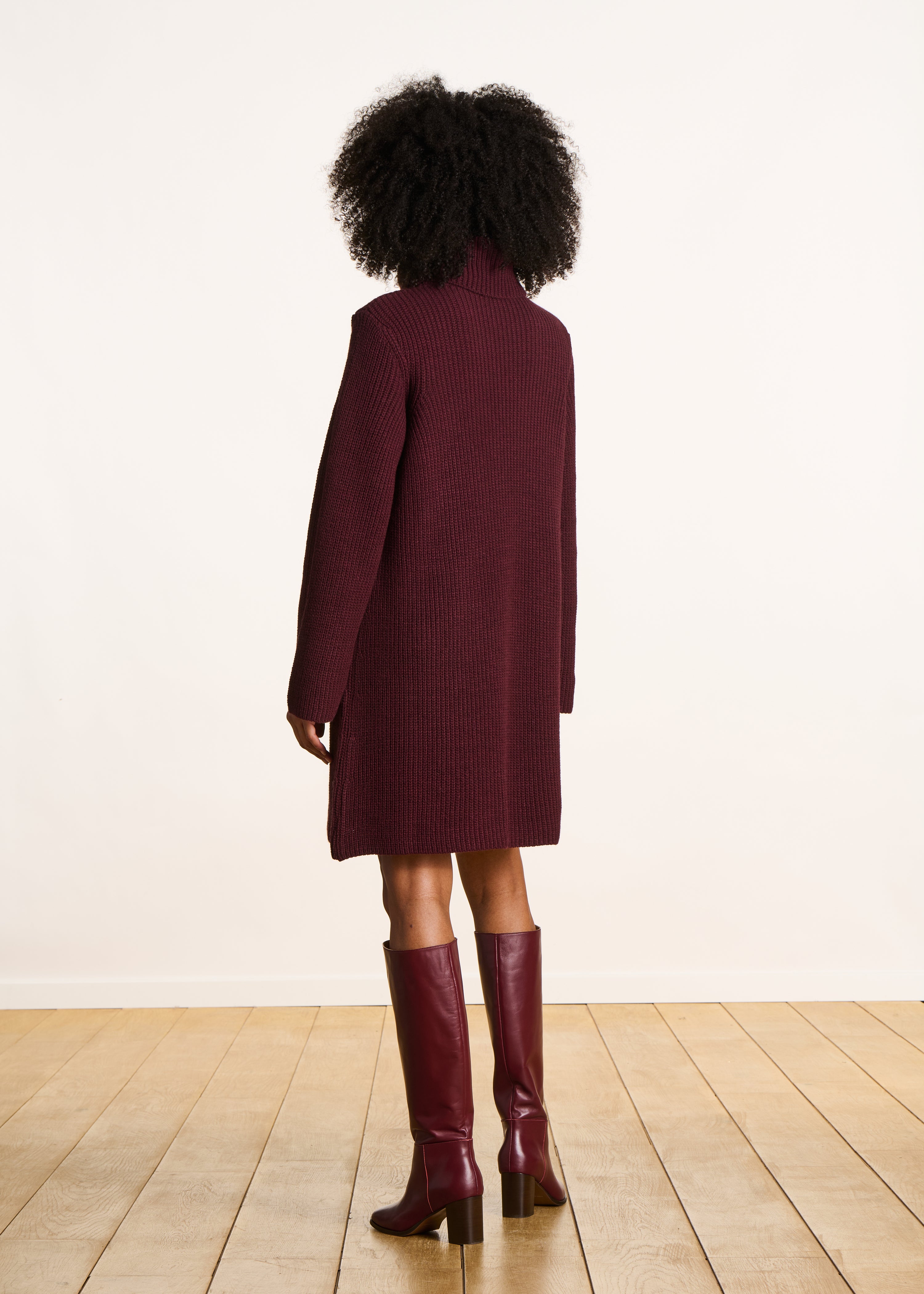 - Robe courte en maille côtes perlées - Col roulé - Manches longues amples - Coupe trapèze
