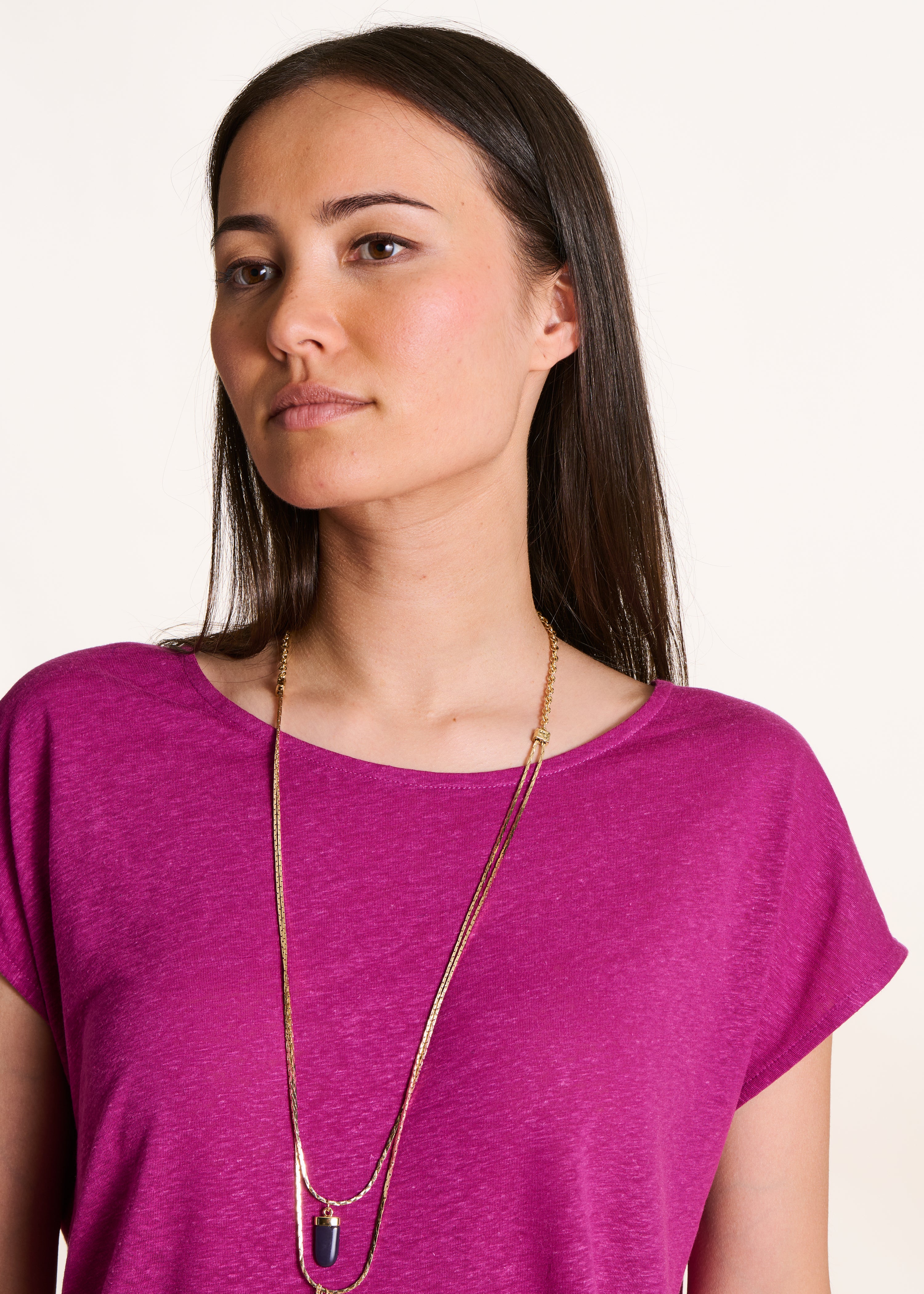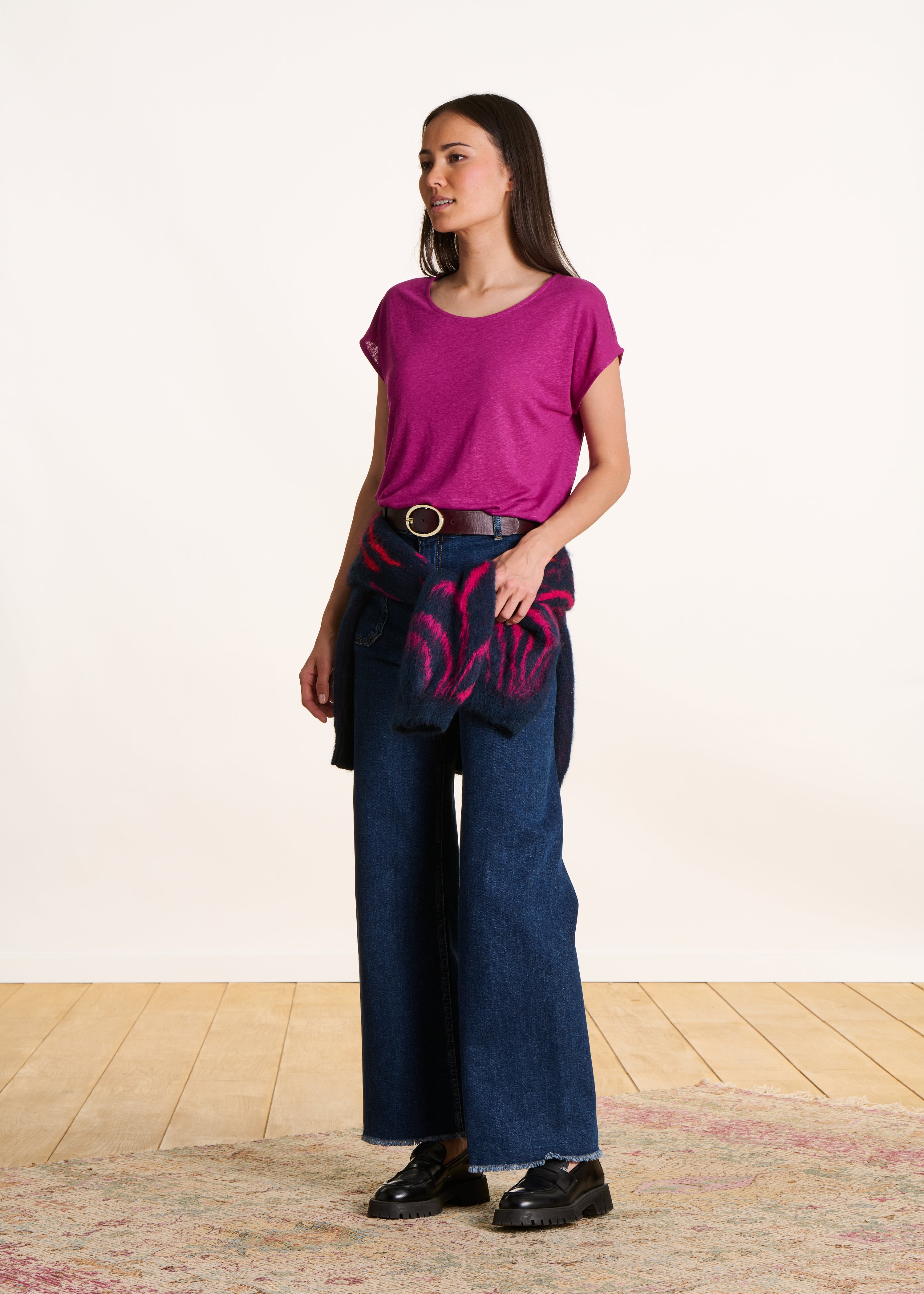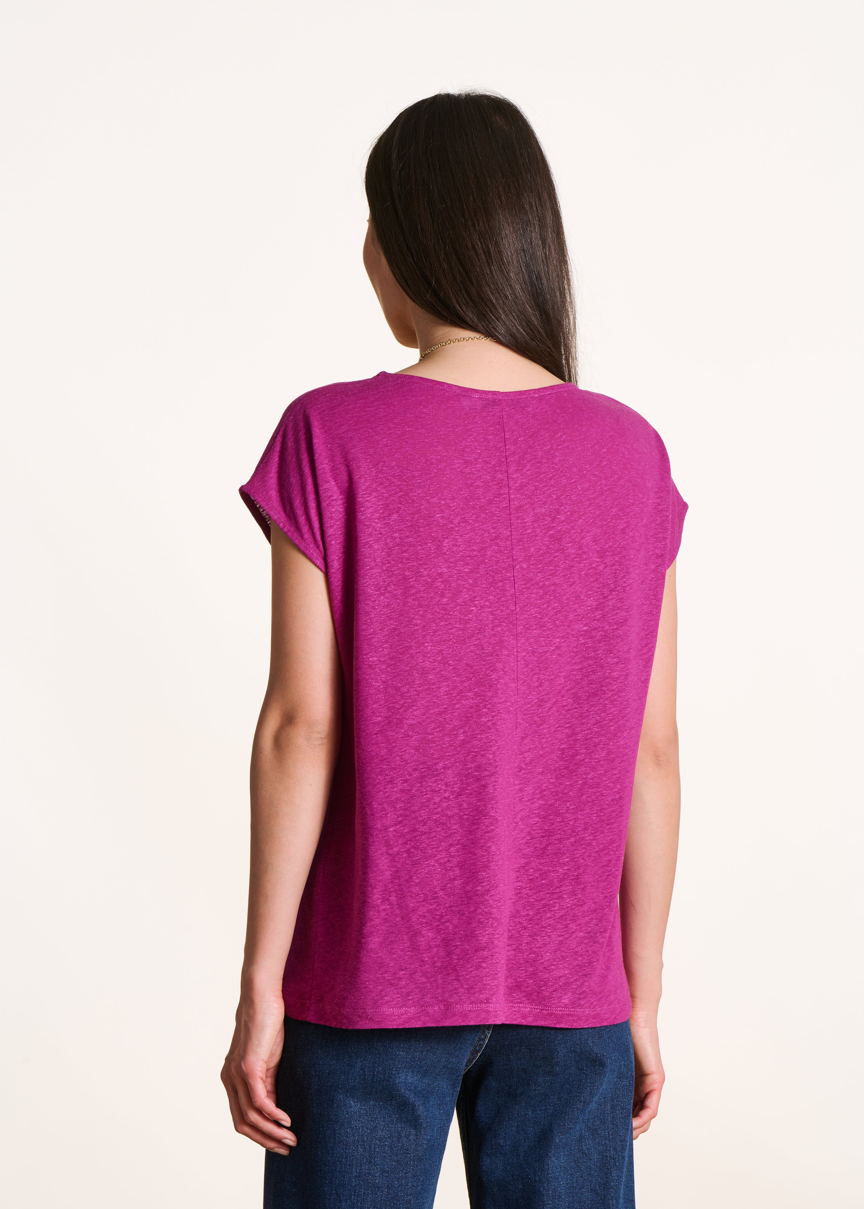 T-shirt droit rose fuchsia col rond en lyocell lin
