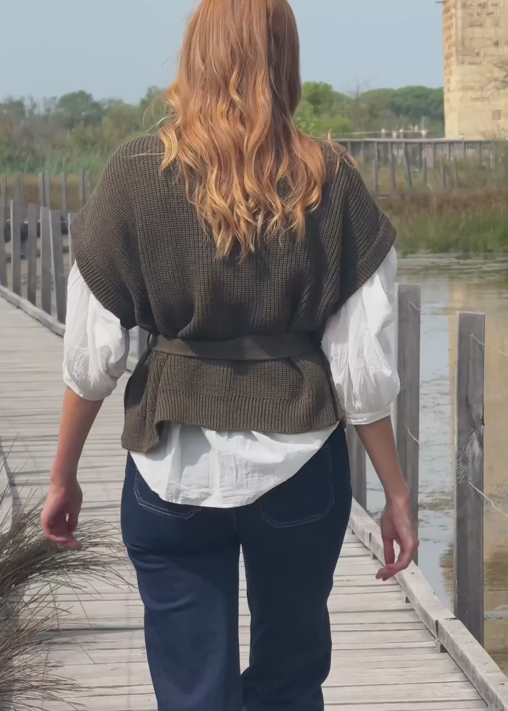 - Casaco com cinto em malha canelada com brilhantes - Mangas curtas - Decote redondo